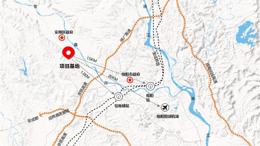 高铁:紧邻宝成铁路、成绵乐铁路、成西铁路、成兰铁路,距离绵阳站15分钟车程,距离皂角铺站(货运)10分钟车程。