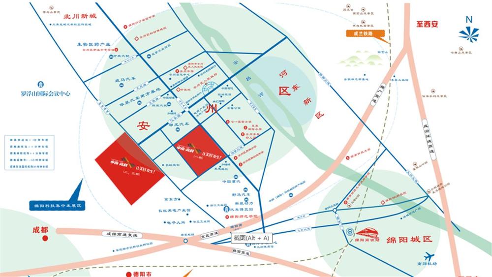 地处成都、重庆、西安构成德西部经济“金三角”中心,成德绵经济走廊的腹心地带和人口红利聚集区,距离成都100公里、重庆300公里、西安550公里,与绵阳科技城实现同城化发展,被纳入绵阳科技城军民融合产业集中发展区核心建设地带,是绵阳重要的产业吸纳区域。
