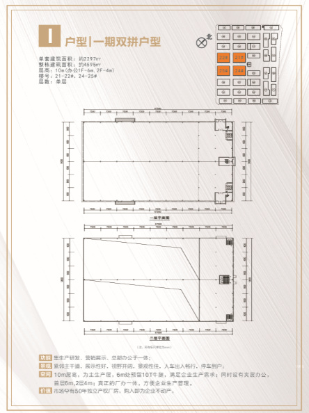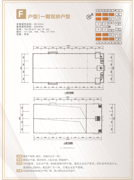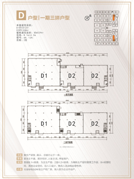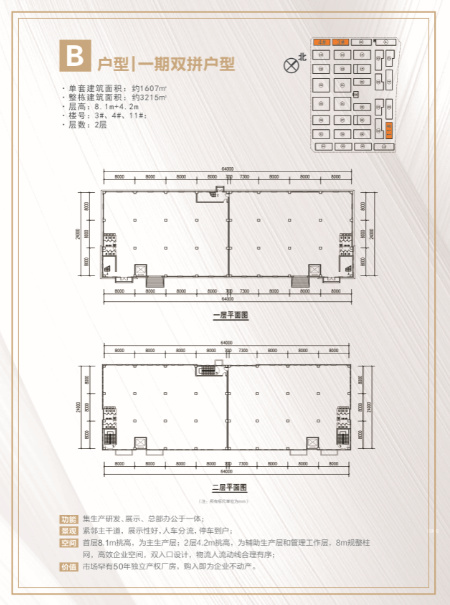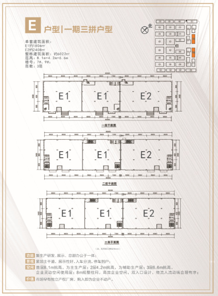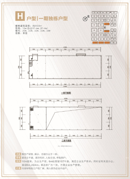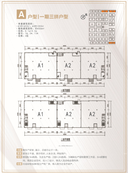 框架厂房层高:首层8m,二层及以上层高6.6m,二、三层独栋或多拼,面积1200平起
