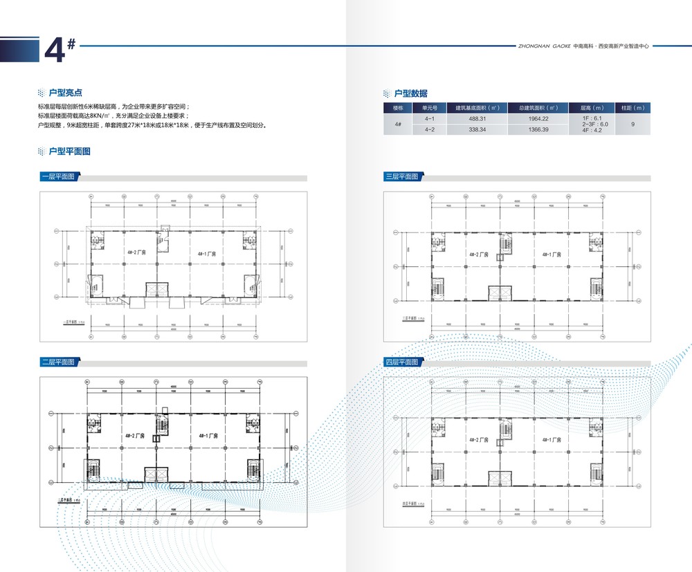 建筑面积1400−3000㎡,层高6.1/6/6/4.2m,标准层承重800kg/㎡。