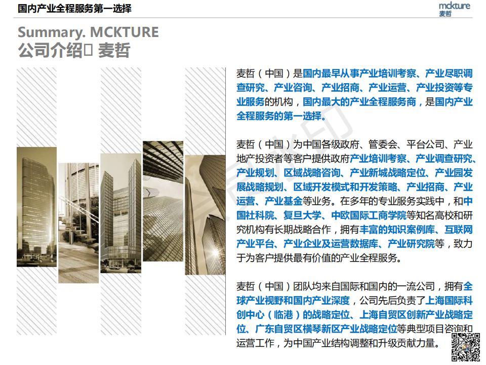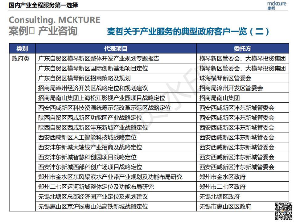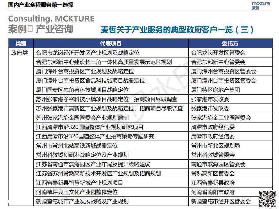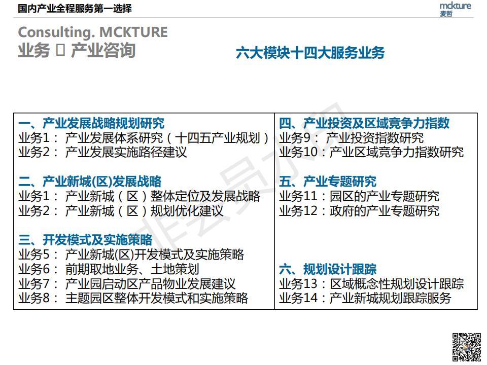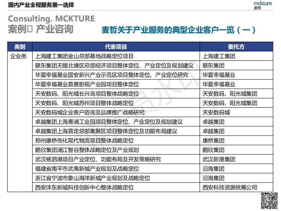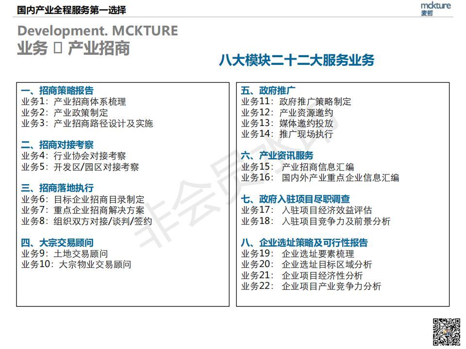 招商网&麦哲(中国)为中国各级政府、管委会、平台公司、产业地产投资者等客户提供政府产业培训考察、产业调查研究、产业规划、区域战略咨询、产业新城战略定位、产业园发展战略规划、区域开发模式和开发策略、产业招商、产业运营、产业基金等业务。在多年的专业服务实践中,和中国社科院、复旦大学、中欧国际工商学院等知名高校和研究机构有长期战略合作,拥有丰富的知识案例库、互联网产业平台、产业企业及运营数据库、产业研究院等,致力于为客户提供zui有价值的产业全程服务。