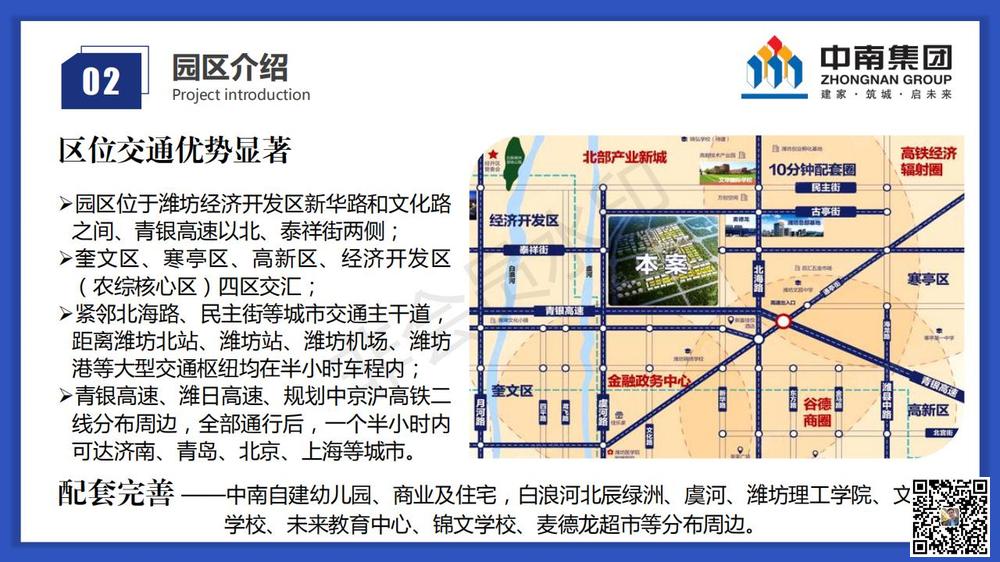 配套完善 ——中南自建幼儿园、商业及住宅,白浪河北辰绿洲、虞河、潍坊理工学院、文华 学校、未来教育中心、锦文学校、麦德龙超市等分布周边。