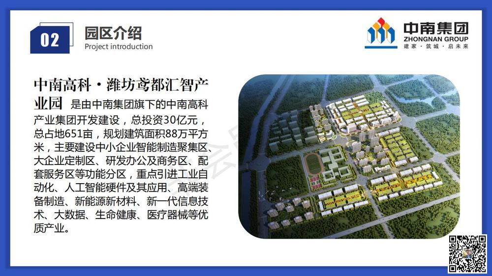 是由中南集团旗下的中南高科产业集团开发建设,总投资30亿元, 总占地651亩,规划建筑面积88万平方 米,主要建设中小企业智能制造聚集区、 大企业定制区、研发办公及商务区、配 套服务区等功能分区,重点引进工业自动化、人工智能硬件及其应用、高端装 备制造、新能源新材料、新一代信息技 术、大数据、生命健康、医疗器械等优 质产业。