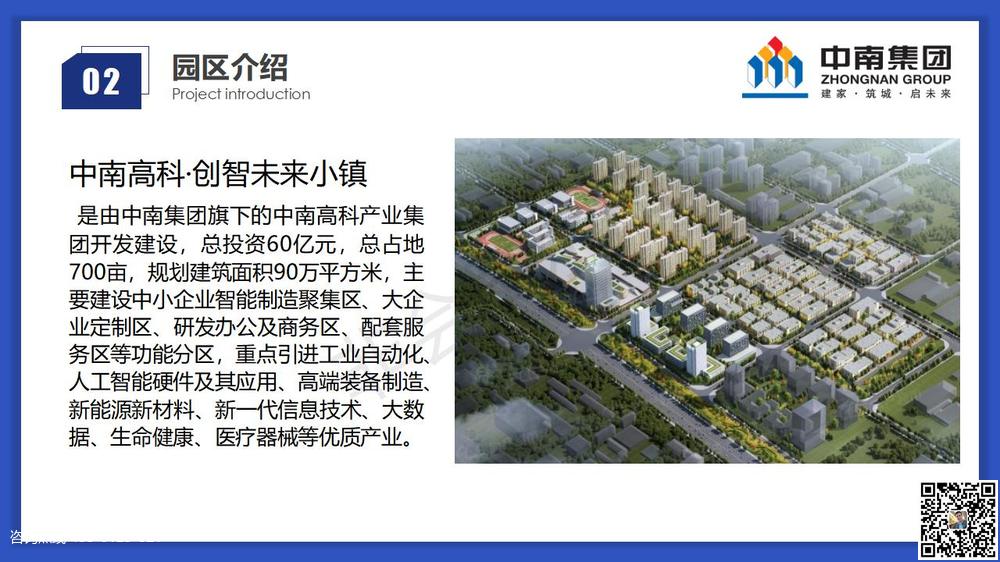 由中南集团旗下的中南高科产业集团开发建设,总投资60亿元,总占地700亩,规划建筑面积90万平方米,主要建设中小企业智能制造聚集区、大企业定制区、研发办公及商务区、配套服务区等功能分区,重点引进工业自动化、人工智能硬件及其应用、高端装备制造、新能源新材料、新一代信息技术、大数据、生命健康、医疗器械等优质产业。