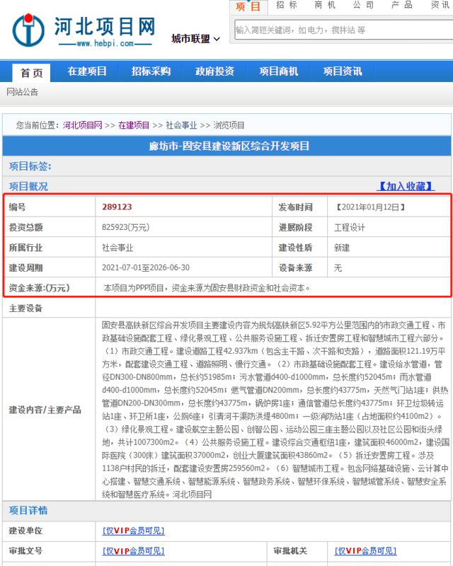 “河北省廊坊市固安县高铁新区综合开发项目”已批复,该项目投资总额825923万元,为ppp项目。