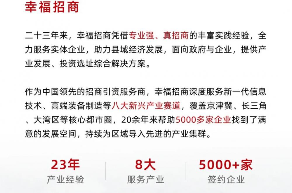 幸福招商·面向全国广大县域经济源地接受招商引资服务委托, 服务制造业企业在全国各开发区落地并享受相关招商引资政策,厂房资源丰富、政策给力,已累计签约入园企业 3000余家,其中500强企业 33家,上市公司49家,国家高新技术企业 560余家,知名品牌 420余家,专精特新企业20家,外资企业 34家。