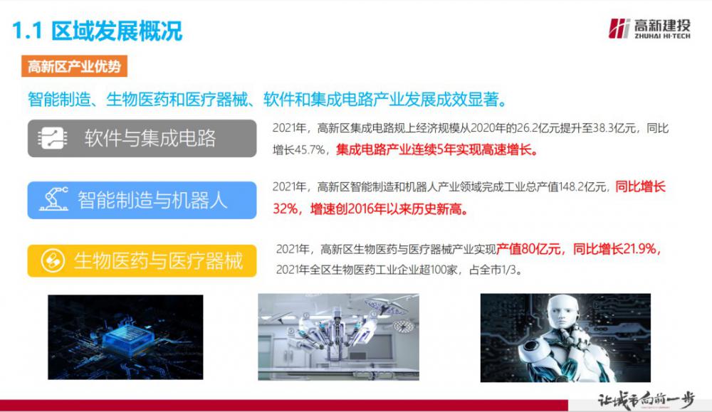 珠海高新区坚持以高新技术产业为主导,形成了以智能制造、生物医药和医疗器械、软件和集成电路为代表的产业集群。2021年,高新区高新技术企业数量达到580家,占全市三分之一,高新技术产业增加值同比增长20.9%,显示出强劲的发展势头和创新能力。