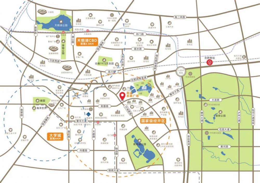 周边5公里汇聚政务商圈奥体中心等、合肥南站、绕城高速出入口、众多大型居民区!