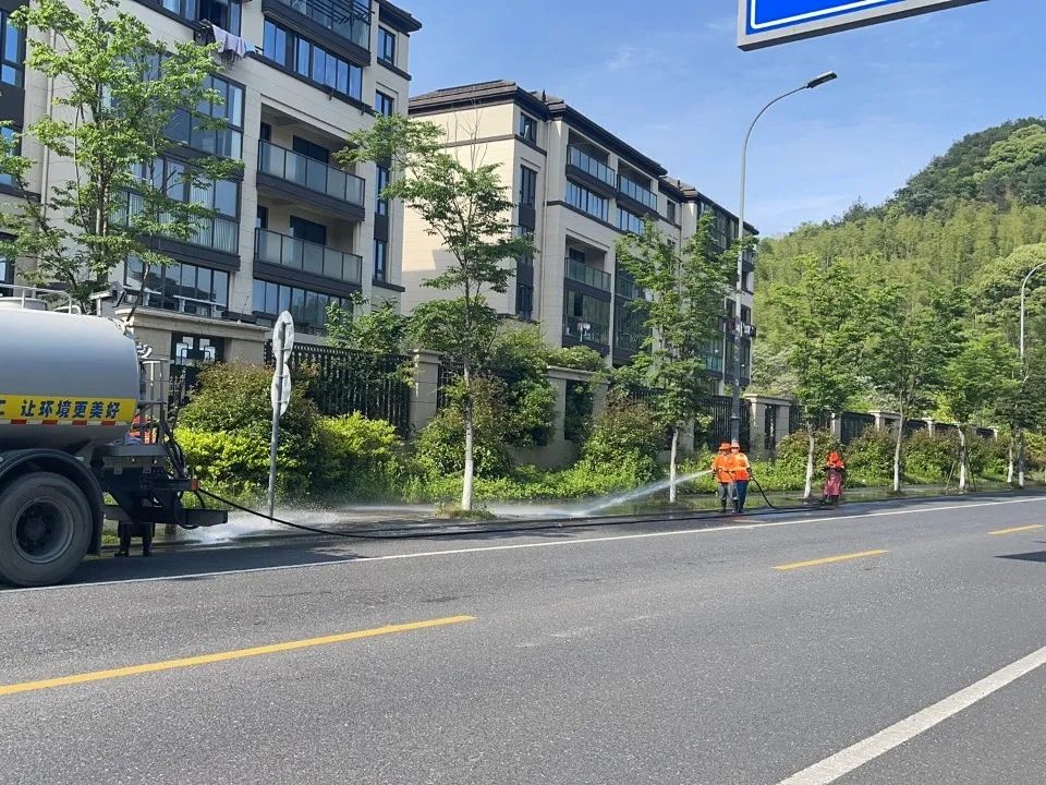 舞阳街道辖区内,清扫车、雾炮车和洒水车沿着塔山街、科源路、游子街一路行至玉屏路开展交叉作业,确保道路干净整洁;武康街道营盘小区附近餐饮店铺林立,县综合执法局工作人员对小区周边的餐饮单位进行全方位检查……