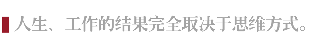 至后我想谈谈“思维方式”。如同前面提到的,“思维方式”是“人生成功方程式”中至关键的要素,它极大左右了方程式的结果。