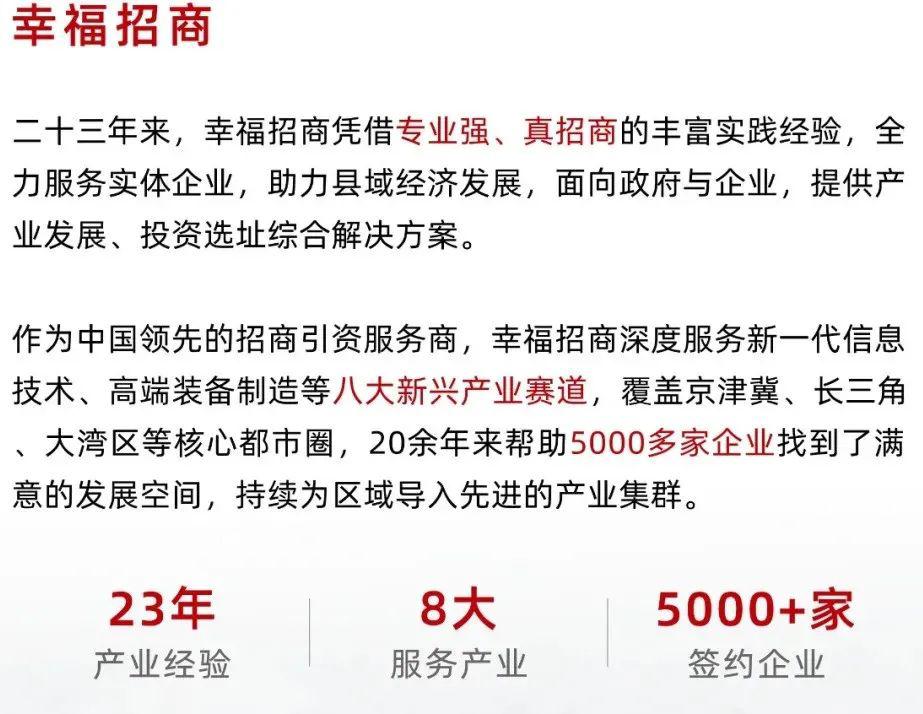 幸福招商·面向全国广大县域经济源地接受招商引资服务委托, 服务制造业企业在全国各开发区落地并享受相关招商引资政策,厂房资源丰富、政策给力,已累计签约入园企业 3000余家,其中500强企业 33家,上市公司49家,国家高新技术企业 560余家,知名品牌 420余家,专精特新企业20家,外资企业 34家。