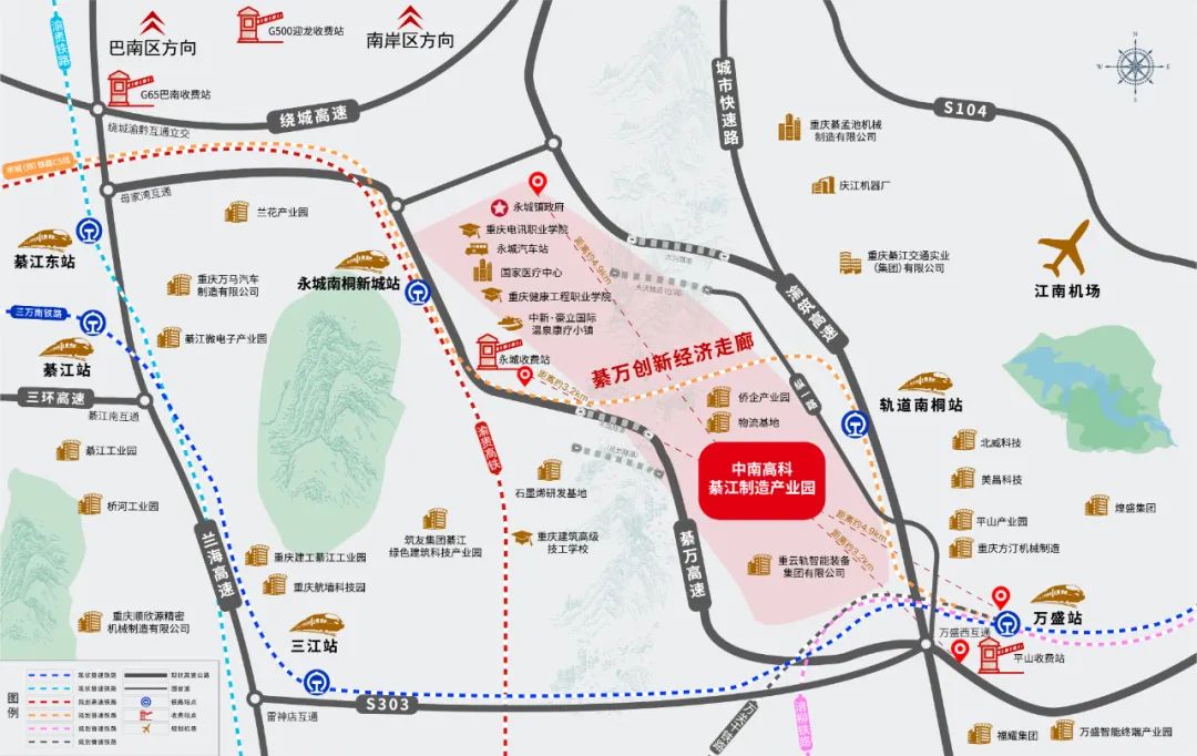 中南高科·綦江制造产业园地处重庆一小时经济圈内,位于“綦万创新经济走廊”。“綦万创新经济走廊”是重庆的“南大门”,是重庆中心城区功能向南拓展的战略支点,是渝黔合作先行示范区,也是全市产业和人口集聚的重要区域。中南高科·綦江制造产业园项目属于政府头部批次预批地。