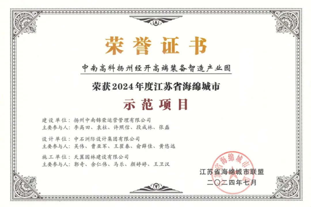 近日,由江苏省住房和城乡建设厅指导开展的“2年度江苏省海绵城市示范项目颁奖仪式”在南京举行。凭借在海绵城市建设中的卓越表现,扬州经开高端装备智造产业园获评“2024年度江苏省海绵城市示范项目”。这是继去年中南高科靖江智造谷产业园项目获“江苏省海绵城市优秀工程项目二等奖“后,高科园区再次获评该类省级荣誉。