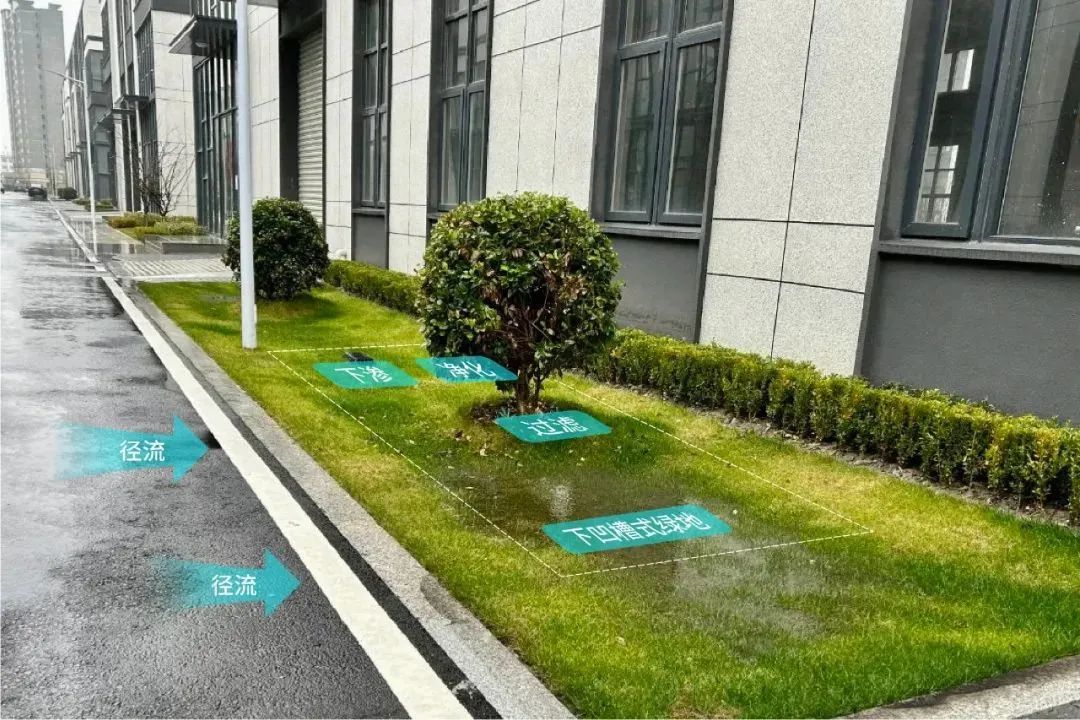 暴雨后实景-下沉式绿地有效蓄积雨水这样的“海绵”设计不仅帮助园区平稳度过汛期,保障了园区企业正常生产经营,收集起来的雨水经过净化处理后,还能用于园区道路冲洗、绿化浇洒和景观补水,一举多得。