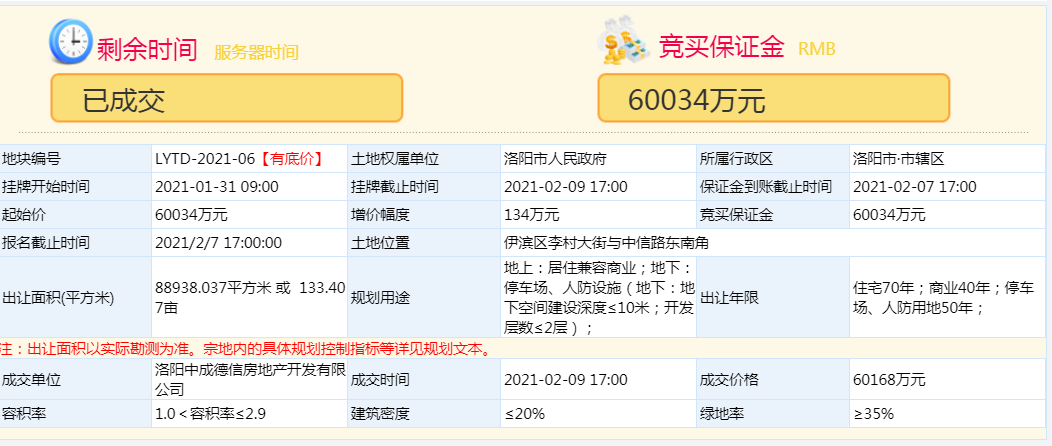 据了解,该项目也是于今年2月9日才成功被拍的,交单价约451万元/亩,楼面价约2333元/㎡,土地溢价率0.22%,为2021年至今洛阳市中心城区出让的首宗溢价地块。