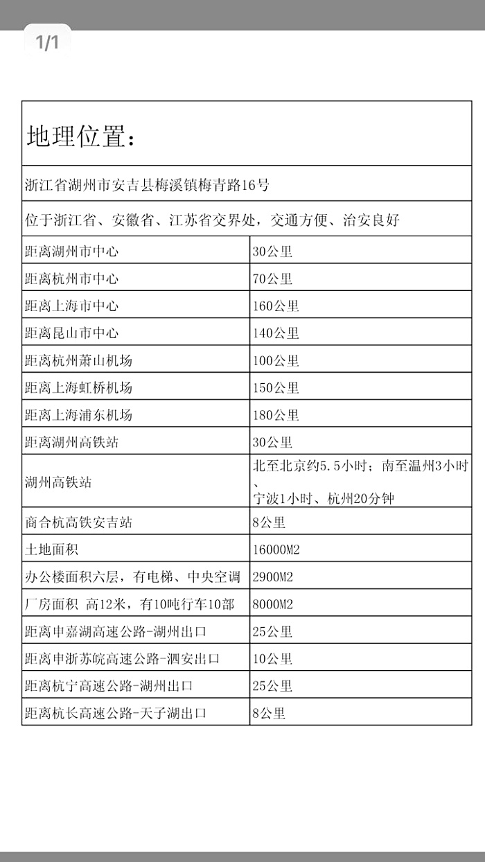 厂房位于浙江湖州市安吉县梅溪镇梅青路16号,位于浙江省、安徽省、江苏省交界处,交通方便,治安良好,离湖州市中心30公里,离杭州市中心160公里,离昆山市中心140公里,离杭州萧山机场100公里,离上海虹桥机场地150公里,离上海浦东机场180公里,湖州高铁站30公里,安吉高铁站8公里,厂房占地16000平方米,6层精装修办公楼2900平方米,高12米带10吨10吨行车单层厂房8000平方米,优惠价出租,欢迎相关企业咨询和实地查看。