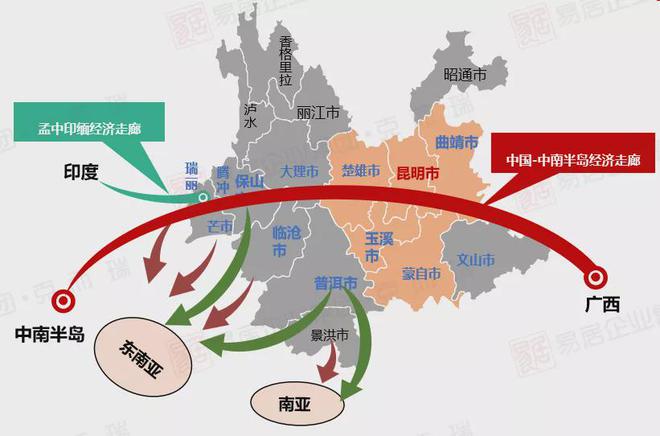 “一带一路”中国-中南半岛经济走廊纵贯中南半岛国家,途经滇中、滇西城市群,是中国连接中南半岛的大陆桥,也是中国与东盟合作的跨国经济走廊;孟中印缅经济走廊辐射滇西城市,将带动南亚、东南亚、东亚三大经济板块联合发展,对瑞丽、芒市等口岸城市的发展至关重要。“一带一路”的重大决策将把云南打造成中国面向南亚、东南亚的窗口。