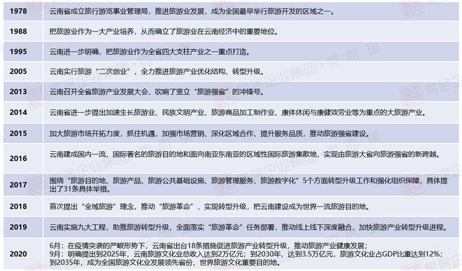 自1978年云南省旅行展览事业管理局成立,云南省推进旅游产业发展的步伐不断加快,明确旅游产业在云南经济发展中的地位,历年以来,旅游产业不断升级转型,实现跨越式发展。
