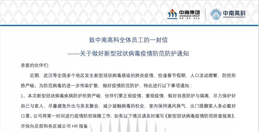 在疫情严峻的当下,中南高科对外不仅积极筹措防疫物资、慰问支援抗疫企业。对内,中南高科不断对员工开展疫情防护宣贯,倡导员工“正视疫情,重视疫情,做好自我防护与隔离”。