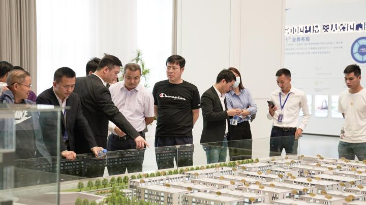 随后,各位嘉宾及到场企业家一起参观了招商中心及现场工地。项目于2021年6月3日举办奠基仪式正式开工,至今3个多月时间,项目已实现一流水全部封顶,二流水主体施工陆续封顶。各位嘉宾及企业家对项目“快建设”的承诺表示肯定,对建设质量及施工管理规范表示赞许。