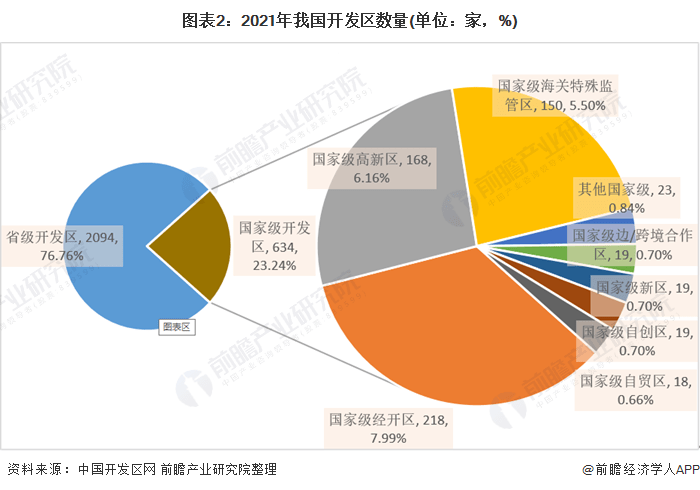 截至2021年4月26日,我国共有各类国家级开发区634家,其中国家级经济技术开发区共有218家,国家级高新技术产业开发区共有168家,国家级海关特殊监管区150家,国家级边/跨境经济合作区共有19家,国家级自贸区共有18家,国家级新区共有19家,国家级自主创新示范区共有19家,其他国家级开发区共有23家;省级开发区共有2094家。