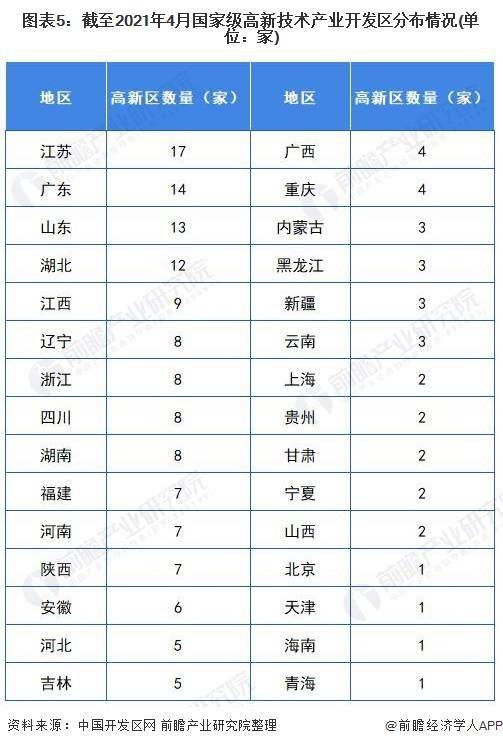 截至2021年4月26日,全国共有168家国家级高新区,分布在30个省市(仅西藏暂未设立国家级高新区)。其中,江苏、广东、山东三个地区的高新区数量蕞多,分别为17家、14家和13家,合计占比26.19%。与经开区数量分布前三名稍有不同,浙江落选,广东省上榜。