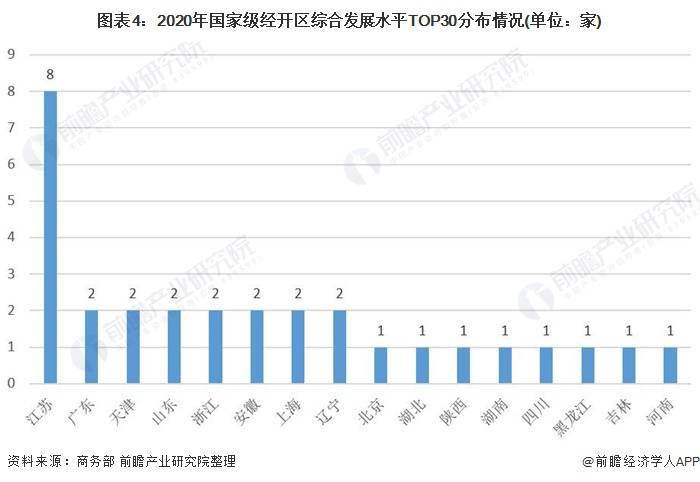 2021年1月27日,商务部发布2020年国家级经济技术开发区综合发展水平考核评价结果。综合发展水平进入前30名的国家级经开区依次分布在江苏8家,广东、天津、山东、浙江、安徽、上海、辽宁等各有2家,北京、湖北、陕西、湖南、四川、黑龙江、吉林和河南等各有1家。