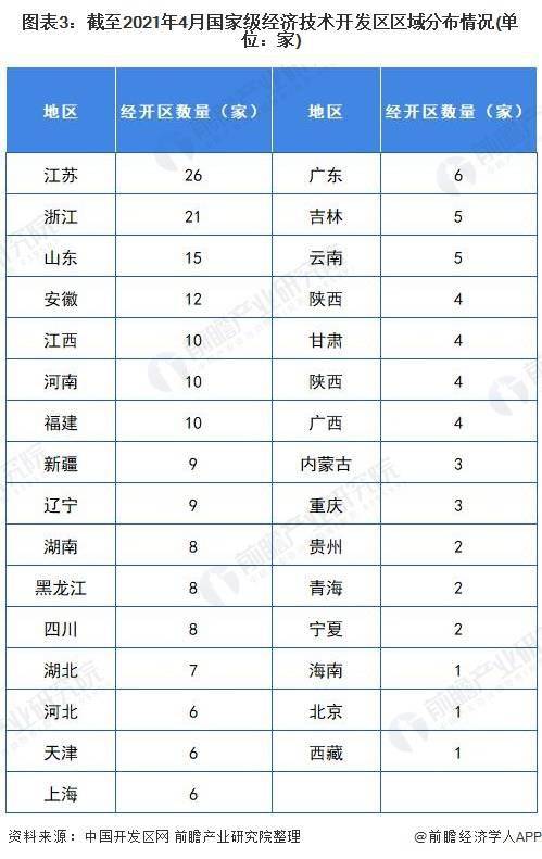 截至2021年4月26日,我国国家级经开区共218个,分布在31个省市。其中,江苏、浙江、山东三个地区的经开发数量蕞多,分别为26家、21家和15家,合计占比28.31%。