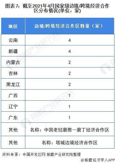 截至2021年4月26日,全国共有19家国家级边境/跨境经济合作区,分布在云南、新疆、内蒙古、吉林、黑龙江、广西和辽宁等地区(地区边境附近),是中国沿边开放城市发展边境贸易和加工出口的区域。