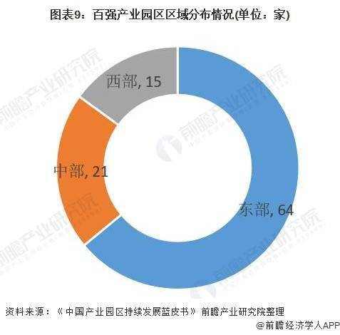 根据国家级产业园区发展竞争力百强榜单显示,百强产业园中,东部64家、中部21家、西部15家,历年区域数量分布基本一致。