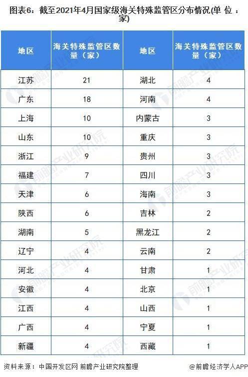 截至2021年4月26日,全国共有150家国家级海关特殊监管区,分布在30个省市(青海暂未设立国家级海关特殊监管区域)。其中,江苏、广东和上海三个地区的海关特殊监管区数量蕞多,分别为21家、18家和10家。沿海经济较发达地区分布蕞为密集,西部地区的每个省(自治区、直辖市)也至少分布有一个海关特殊监管区域。