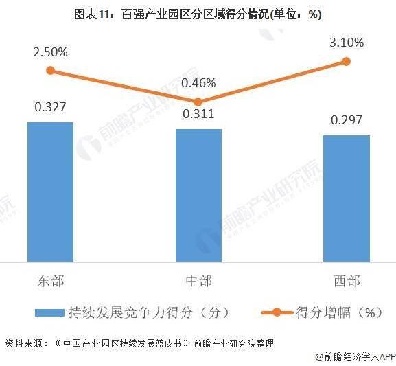根据同济大学发展研究院和新华社中国金融信息中心在沪联合发布的《2018中国产业园区持续发展蓝皮书》,虽然东部的园区发展态势良好,总体数量多于西部和中部地区,从平均得分来看,百强榜东部产业园区平均得分(0.327)均高于中部(0.311)和西部产业园区(0.297),但从增速来看,西部园区的平均得分增速(3.1%)均高于东部(2.5%)和中部产业园区(0.46%)。