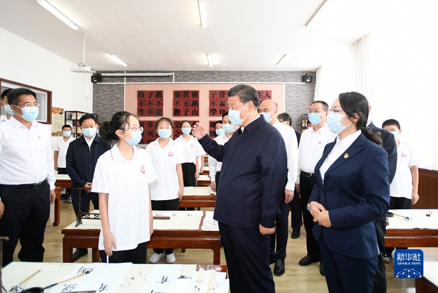 9月13日至14日,中共中央、国家、在陕西省榆林市考察。这是14日上午,在绥德实验中学考察时,同正在练习书法的学生亲切交流。新华社记者 李学仁 摄