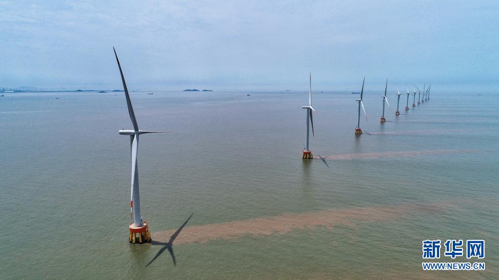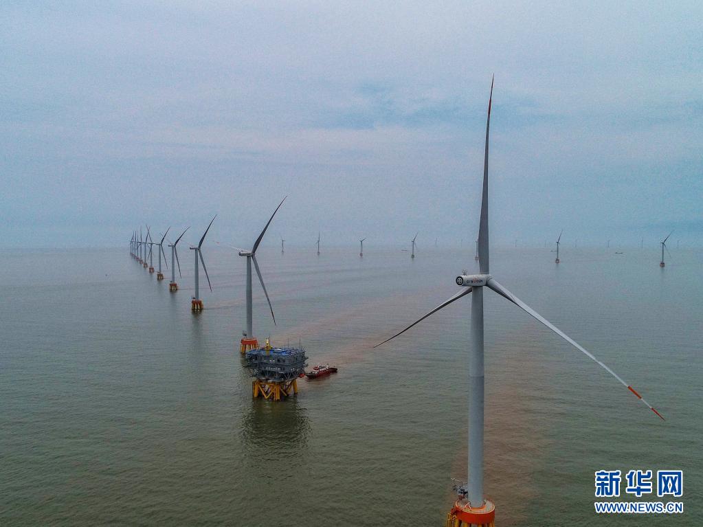 空中俯瞰岱山号海上风电场(5月6日摄,无人机照片)。 当日,位于浙江舟山北部海域的岱山4号海上风电场并网接入工程顺利投运,开始正式并网运行发电。海风“送来”的清洁能源,源源不断供给鱼山岛绿色石化基地。 浙江省舟山市北部海域的岱山4号、嵊泗5号、6号海上风电场是浙江省蕞大的海上风电场群。此次正式并网的岱山4号海上风电场共设风力发电机组54台,总装机规模为4兆瓦,每年上网电量可达6.18亿千瓦时。该电量将全部用于浙江舟山绿色石化基地,持续为舟山绿色基地注入绿色动力。 新华社记者 徐昱 摄