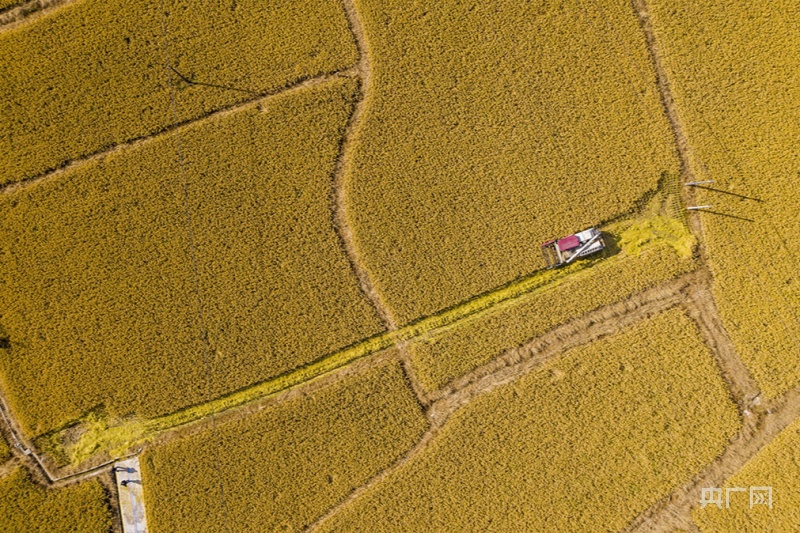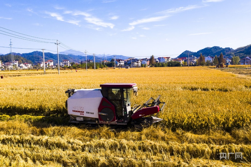 央广网杭州1月16日消息(记者 魏炜 通讯员 王宇锋 何江桥)眼下正是晚稻丰收时节,杭州市临安区於潜镇光明农场的70余亩稻田喜获丰收,遍野金黄、沉甸甸的稻穗压弯了稻秆,阵阵微风卷起金色波浪。田间地头机器轰鸣,收割机在稻田间来回穿梭作业,一派繁忙丰收景象。