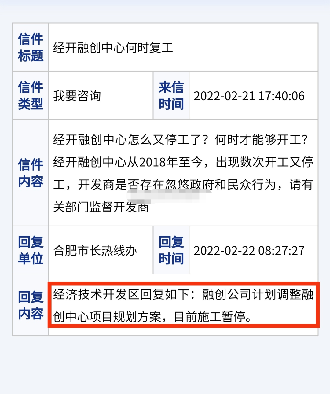 网友问到:经开融创中心怎么又停工了?何时才能够开工?经开融创中心从2018年至今,出现数次开工又停工,开发商是否存在忽悠政府和民众行为,请有关部门监督开发商!