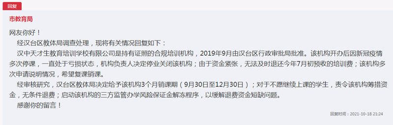 汉中市教育局回复称,经汉中市汉台区教体局调查,汉中天才生教育培训学校有限公司是持有证照的合规培训机构,2019年9月由汉台区行政审批局批准。该机构开办后因新冠疫情多次停课,一直处于亏损状态,机构负责人决定停业关闭该机构;由于资金紧张,无法及时退还今年7月初预收的培训费;该机构多次申请说明情况,希望复课销课。