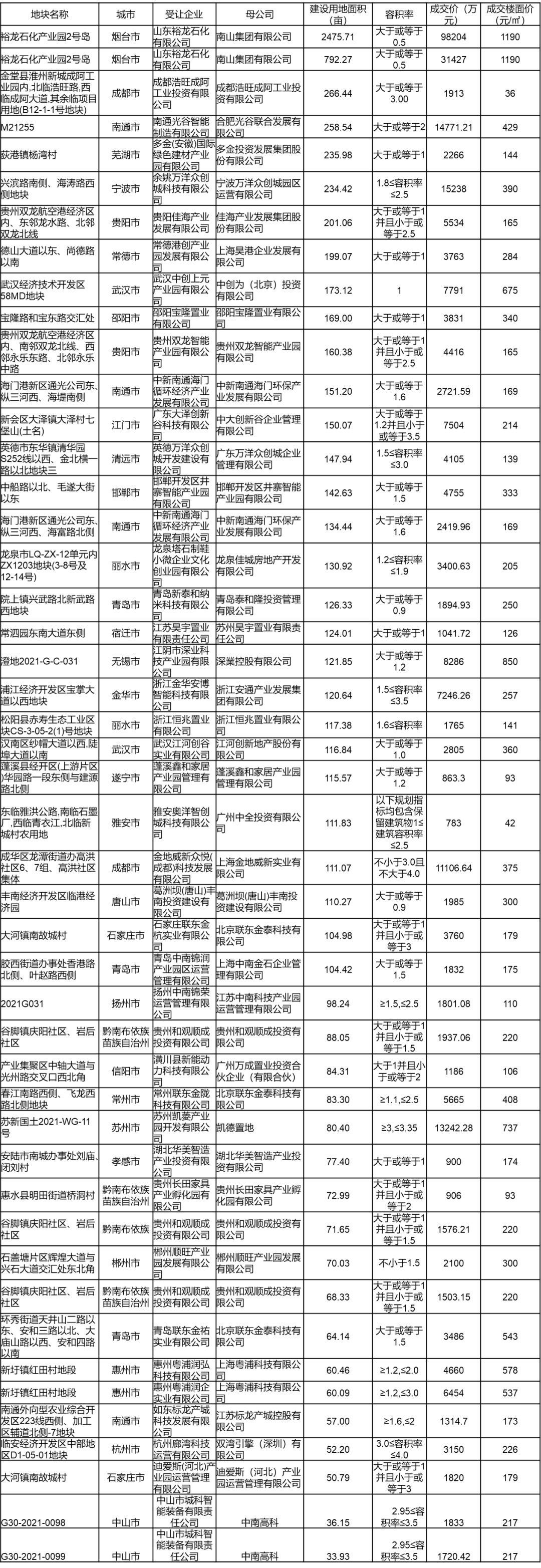 华东片区企业以83块地块位列榜首,其中山东省企业数量蕞多。其次,西南地区企业占去了其中50个席位,东北片区则占据了20个席位。东北地区项目主要集中于哈尔滨、鞍山等传统工业强市,用途较为单一,且单个企业拿地面积较小,仅两家企业拿地面积超过百亩,无一跻身前三十。西南片区企业拿地比较集中,多见于重庆、雅安、自贡、黔南、黔西南五市。但企业拿地用途更为多样化,大面积土地出让也更多。